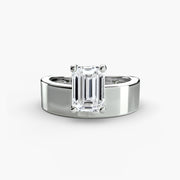 With a bold wide band, this solitaire ring makes a confident statement while highlighting the center stone with timeless elegance.